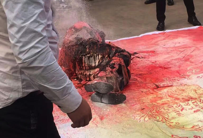 新郎身上被喷满了酱油醋、红墨水、灭火器干粉,由于双脚被捆住,此时新郎已经被整趴下。