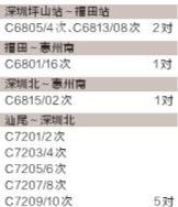 新增城际动车组列车具体为:深圳坪山站~福田站C6805/4次、C6813/08次2对,每天开行2对共4趟列车,极大地拉近了坪山新区与福田中心区的距离;福田~惠州南C6801/16次1对,深圳北~惠州南C6815/02次1对,汕尾~深圳北C7201/2次、C7203/4次、C7205/6次、C7207/8次、C7209/10次5对。