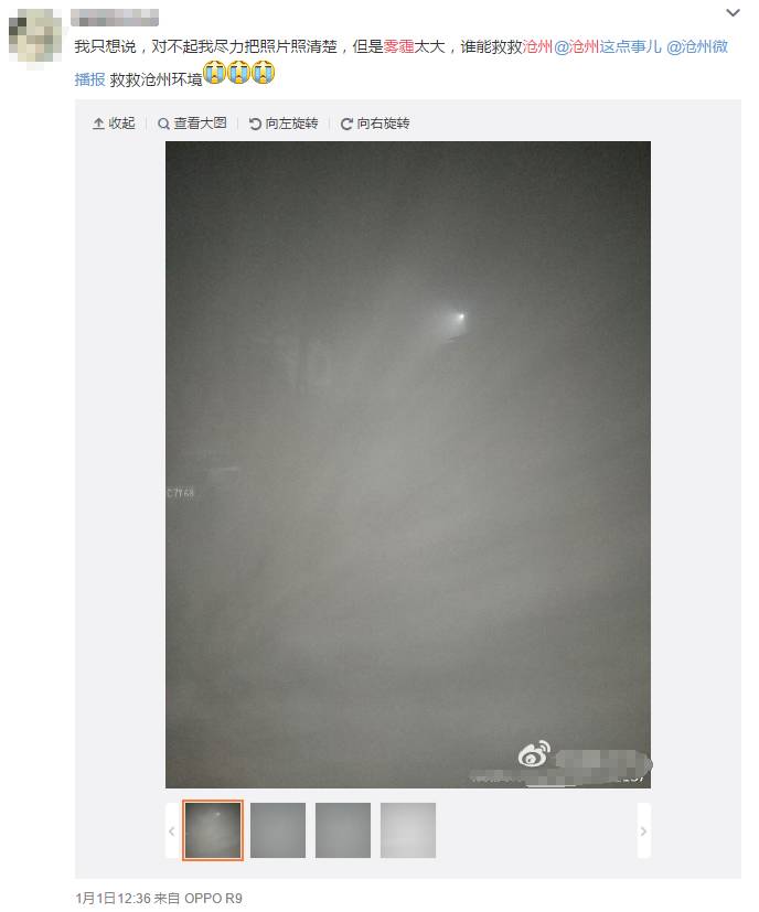 ▲有网友在微博晒出的沧州雾霾天气图片。图片来源:新浪微博