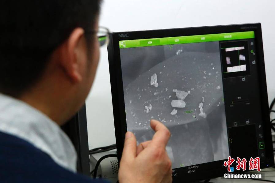 北京化工大学高分子纳米复合材料实验室刘勇教授通过台式扫描电子显微镜,观察近期使用后的防霾鼻罩滤芯上采集的雾霾颗粒,以及分析雾霾颗粒里面含有的各种元素。