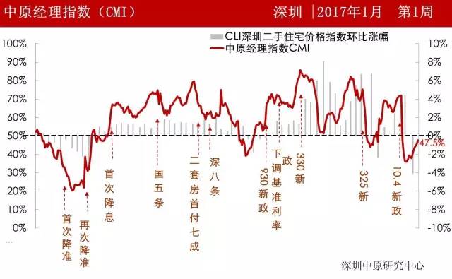 据深圳中原研究中心监测显示,上周深圳中原经理指数回升2个百分点,达到47.5%的水平。经理指数目前是10月新政之后第五周连续回升,渐进50%荣枯线水平。深圳中原报价指数回升1.8个百分点,稳攀至31.4%荣枯线以上,近期来看呈现震荡回升之势。