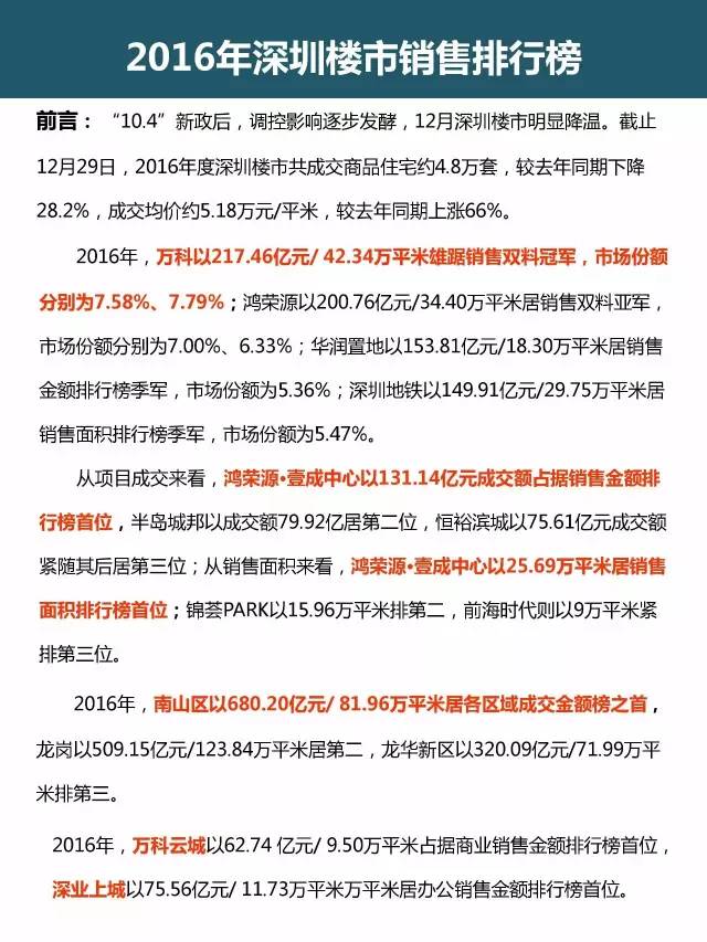 2016年深圳楼市排行榜,房企、住宅、片区、商业、办公top10全在这