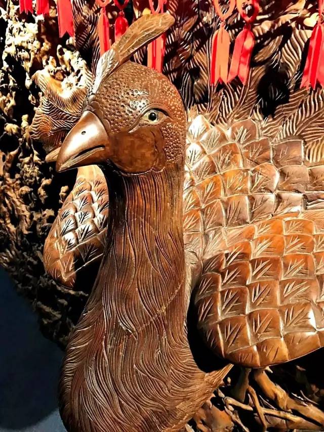 门口摆了个霸气侧漏、形似凤凰的根雕作品,羽毛纹路清晰可见,实在忍不住,边惊叹边上手摸一把。