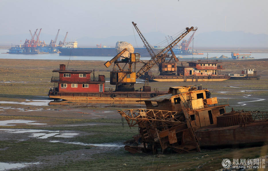 鄱阳湖枯竭 大型船只撤离不及被困湖底