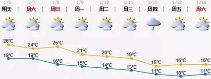 6-8日天气持续温暖6-8日多云间阴天,有轻雾或霾,部分时间能见度低,其中,6日气温19-26℃;9-12日冷空气补充频繁,云量明显增多,间中有小雨,气温逐日下降。