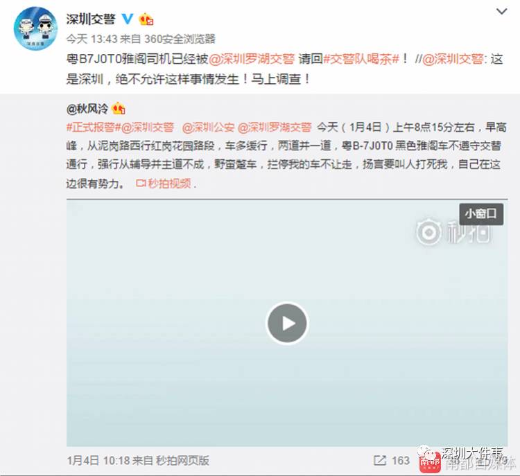 @深圳交警也并未让大家等太久,于今天下午连发3条微博通报案件进展:粤B7J0T0雅阁司机曹某光驾车变道影响其他车辆正常通行,罚200元;路上非法拦截机动车,不听劝阻,罚2000元。曹某光对处罚无异议!并向对方道歉!