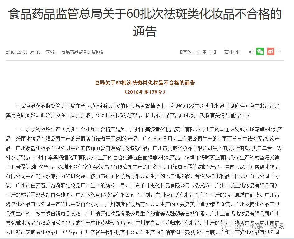 新闻提要 国家食品药品监督管理总局近日在官网发布通告,称在全国范围组织开展的化妆品监督抽检中,发现60批次祛斑类化妆品存在非法添加禁用物质问题。60批次不合格产品中,广州厂家占据“大半江山”,深圳九家企业也上了黑榜。