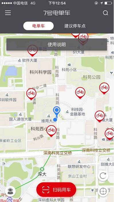 科苑北路一带有深圳知名高校深圳大学,亦是腾讯等高科技公司的驻扎地,沿途各类共享单车密集分布。7号电单车和普通共享单车类似,打开APP后即可看到周围电单车的分布情况,可以用APP扫码或在APP内输入电单车编号的方式开锁。记者打开该APP并启用搜索功能,发现附近即停有若干辆电单车,但投放密度远低于摩拜、OFO、小蓝等单车品牌: