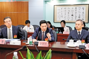 区党代表、区委筹备组组长余新国在分组讨论上发言。