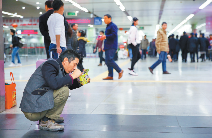 晚10点整,记者来到火车站候车大厅,候车室的空气中弥漫着“老坛酸菜牛肉面”的味道。走廊上坐满了返乡的人群,旅客背着大小各异、五颜六色的行李,眼中攒满归家的期待。
