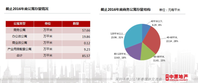 截至2016年底,深圳商务公寓存量约为57.66万平米,再加上其他办公物业、商业、产业用房改为公寓的合计存量约为85.57万平米。