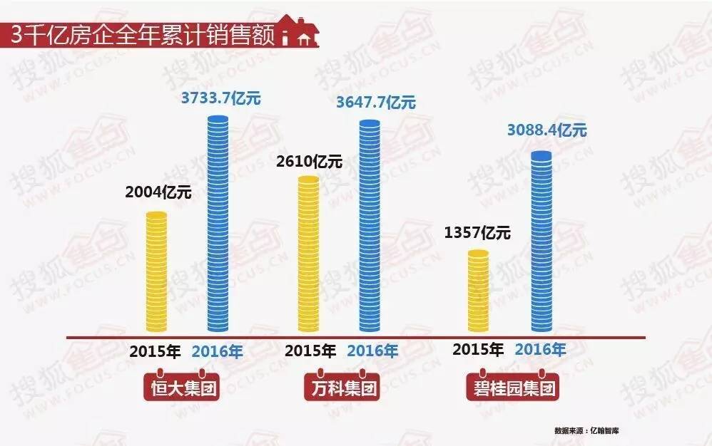 2016年,恒大、万科、碧桂园全年销售额突破过3000亿,3家销售业绩之和达到惊人的10468亿元。这 比南京市2016年全年生产总值(10450亿)还要多,而2016年中国突破万亿GDP的城市也仅有11个。