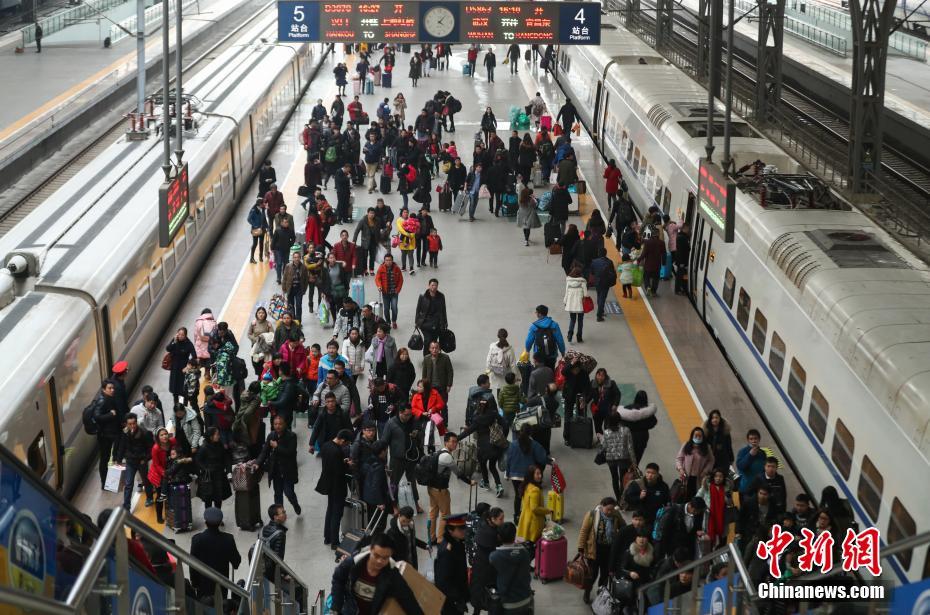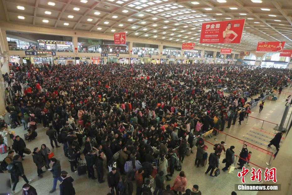 1月16日,大批旅客在汉口火车站乘坐火车出行。随着春节的临近,武汉各火车站迎来客流高峰。中新社记者 张畅 摄