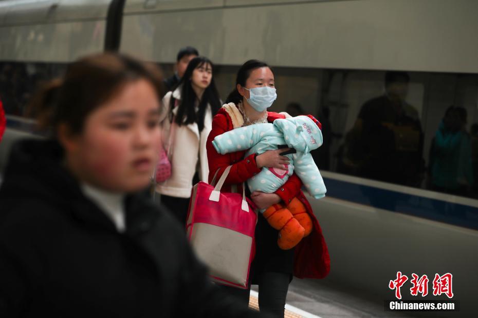 1月16日,武汉汉口火车站,一位旅客抱着小孩踏上回家的列车。随着春节的临近,南来北往的人们纷纷踏上回家的路途。忍耐着漫漫长途的辛苦,享受着回家过年的幸福。中新社记者张畅 摄