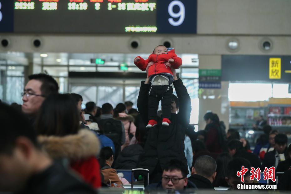 1月16日,武汉汉口火车站候车大厅里,一位乘客把手中的小孩举过头顶活动。随着春节的临近,南来北往的人们纷纷踏上回家的路途。忍耐着漫漫长途的辛苦,享受着回家过年的幸福。中新社记者张畅 摄
