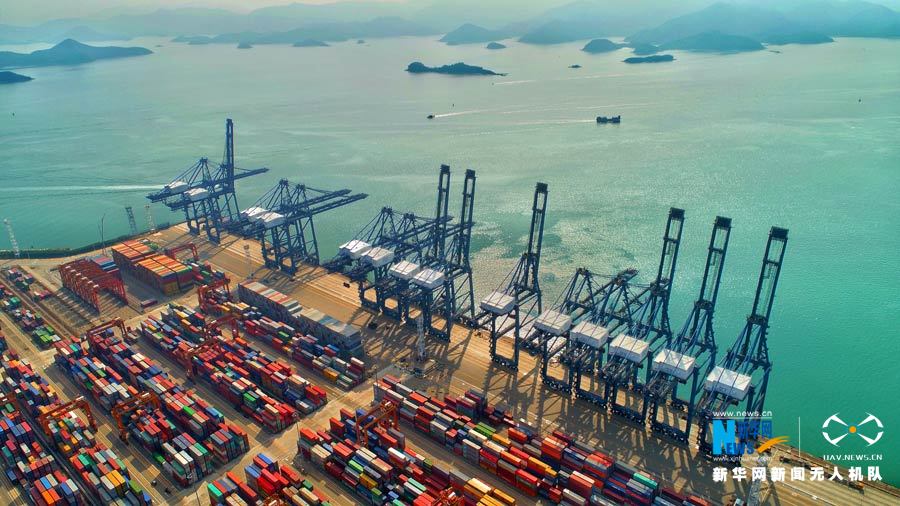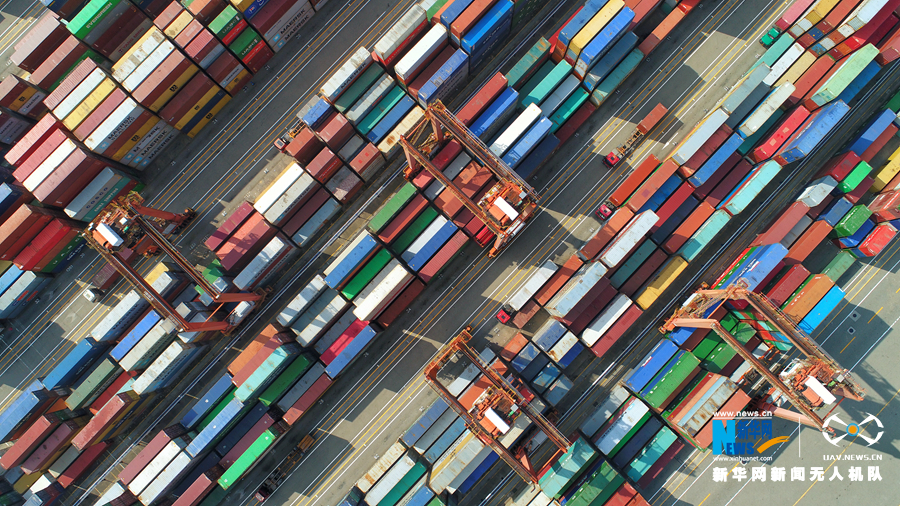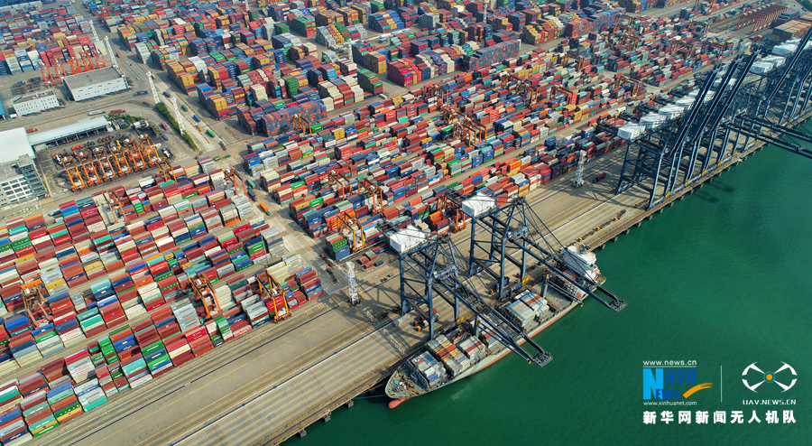 满载集装箱的货轮正停靠在港口。新华网发 于荣海 黄波摄