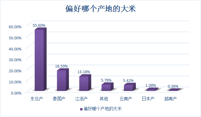对于大米,不同产地也会有不同的口感。深圳市民最爱的大米产地为东北产(55.6%);第二名是 泰国产(18.59%);第三名是江浙产(13.18%)。