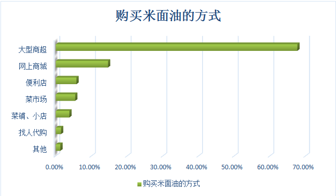 市民主要通过哪种方式购买米面油?大型商超是主流,占比67.69%;其次便是网上商场,第三为菜市场,第四为便利店,第五为菜铺、小店。