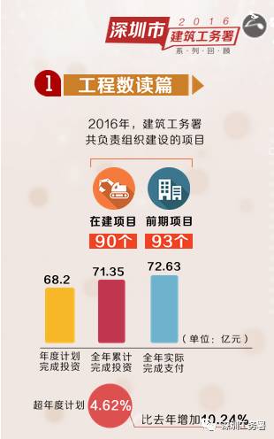新闻提要 2016年,是深圳市建筑工务署打造持续领先的国内一流政府工程管理机构的开局之年;也是打基础、破难题、谋长远,进一步提高管理水平、提升工程质量的一年。这一年,工务署负责组织建设的项目共 183个,其中,在建项目90个,前期项目93个,年度计划完成投资 68.2亿元,全年累计完成投资71.35亿元,超年度计划4.62%(比去年增加10.24%),全年实际完成支付 72.63亿元(含竣工项目结决算款及工程预付款)。