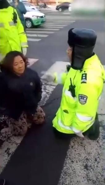 事发时参与执勤的交警要求货车司机出示驾驶证及行驶证时,坐在副驾驶的女子街头下跪,希望不要处罚。