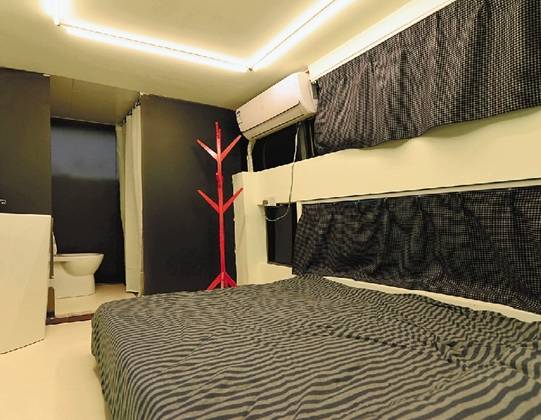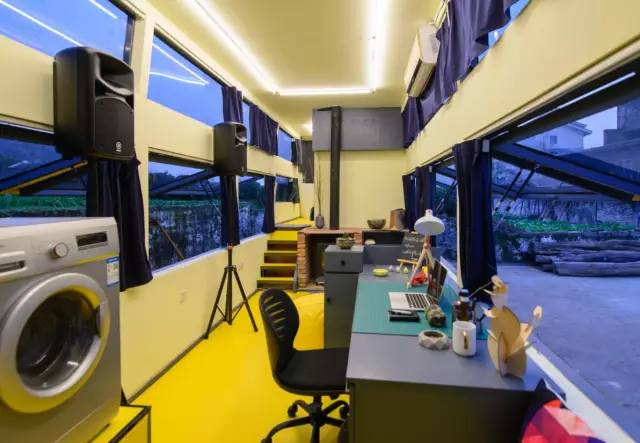 否否偏爱热情青春的黄色,与外观一样,大巴内部主色调也是亮黄色。大门位于车身左前侧,沿台阶上去是敞开式厨房,同时也是吧台,边上放着小冰箱和洗衣机;车身中部左侧是工作台,右侧放着一台留声机,还有两个大音箱;走过工作台,摆着一张小桌和两个懒人沙发,沙发旁是一个壁炉,旁边还堆着柴火;大巴尾部是卧室,里面有一张大大的床。