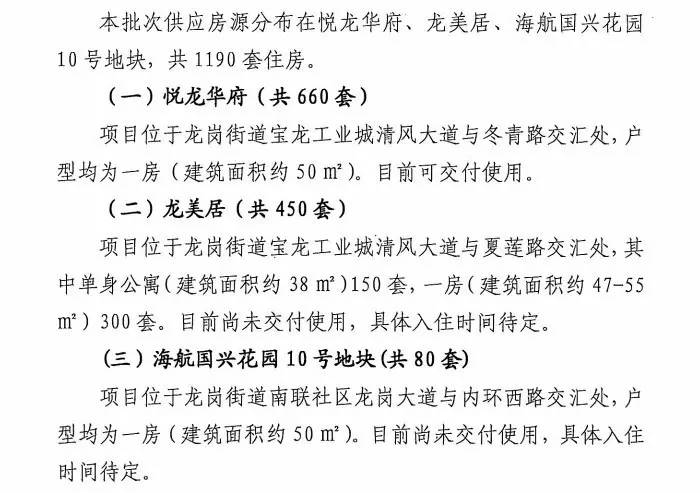 据了解,龙岗区2017年度第一批次人才住房定向配租申请受理时间从1月12—1月25日,主要面向龙岗区企事业单位进行定向配租,供应房源分布在悦龙华府、龙美居和海航国兴花园10号地块,共有1190套住房,均为一房房源。龙岗区住房和建设局关于受理企事业单位定向配租人才住房申请的通告.pdf