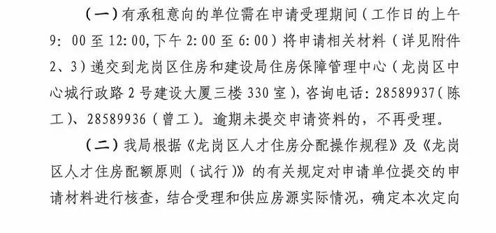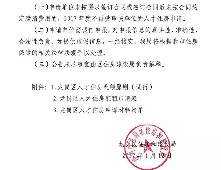 据了解,龙岗区2017年度第一批次人才住房定向配租申请受理时间从1月12—1月25日,主要面向龙岗区企事业单位进行定向配租,供应房源分布在悦龙华府、龙美居和海航国兴花园10号地块,共有1190套住房,均为一房房源。龙岗区住房和建设局关于受理企事业单位定向配租人才住房申请的通告.pdf