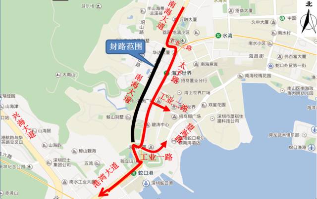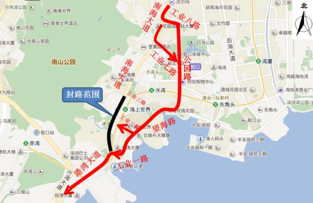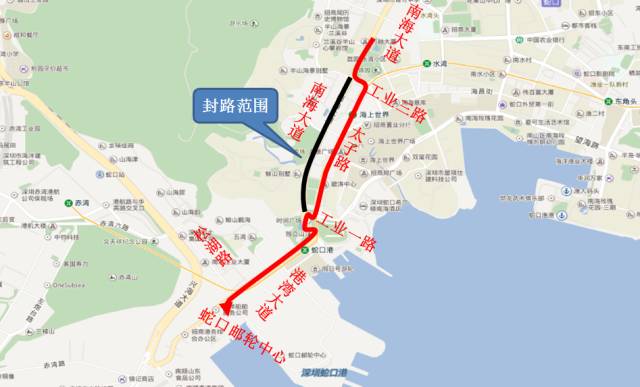 南海大道南行前往蛇口邮轮中心的车辆,可在南海大道工业三路口转入工业三路通行,再经太子路、工业一路、南海大道、港湾大道进入蛇口邮轮中心。