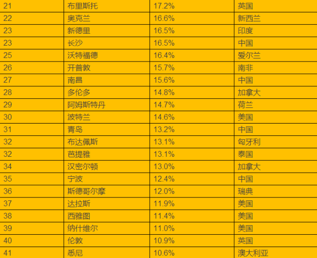前50名投资回报率最高的城市共来自17个国家,其中美国最多,有16个城市进入前50,其次是澳大利亚、加拿大和英国各有4个,德国和日本各有3个,韩国、泰国、西班牙、新西兰和中国各有2个,爱尔兰、法国、荷兰、马来西亚、瑞士和新加坡各有1个。