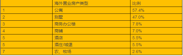 从购置房产类型来看,公寓和别墅以明显的优势成为高净值人群购置最多的海外房产类型。