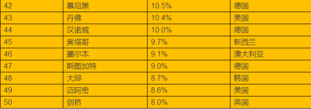 前50名投资回报率最高的城市共来自17个国家,其中美国最多,有16个城市进入前50,其次是澳大利亚、加拿大和英国各有4个,德国和日本各有3个,韩国、泰国、西班牙、新西兰和中国各有2个,爱尔兰、法国、荷兰、马来西亚、瑞士和新加坡各有1个。