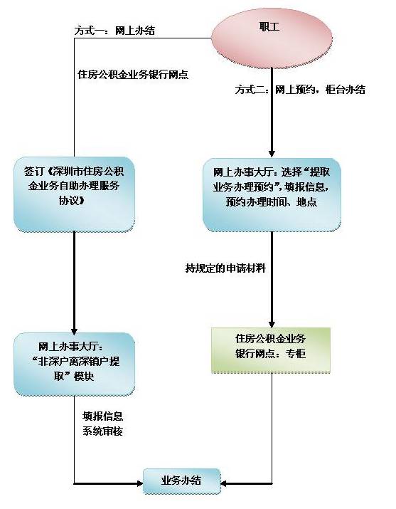 凭个人住房公积金账户及密码登录网上办事大厅,或拨打服务热线等自助方式,选择个人提取业务中“非深户离深销户提取 ”,根据提示,核对无误后点击提交,业务当场受理。
