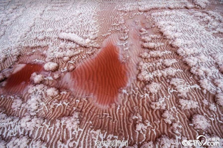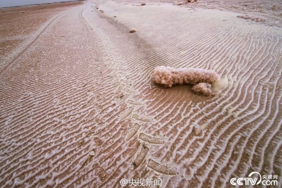 近日,气温骤降,湖水中的硫酸镁析出,形成神奇的“粉红沙漠”奇观。