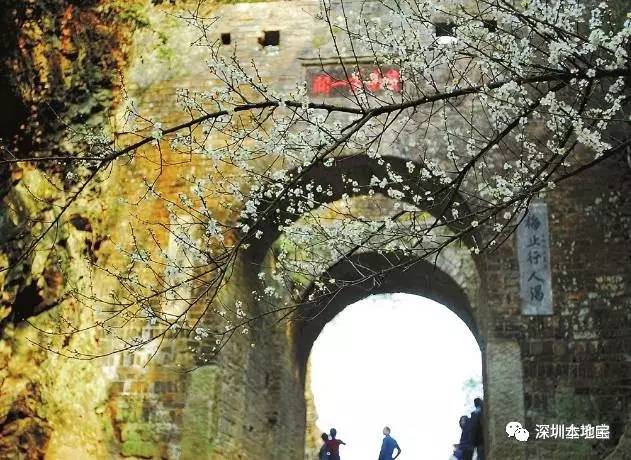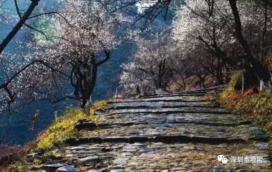 每年12月至来年2月,梅关古道两旁白、红、黄、绿各色梅花次第盛开,漫山遍野。
