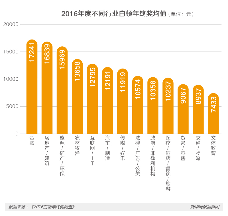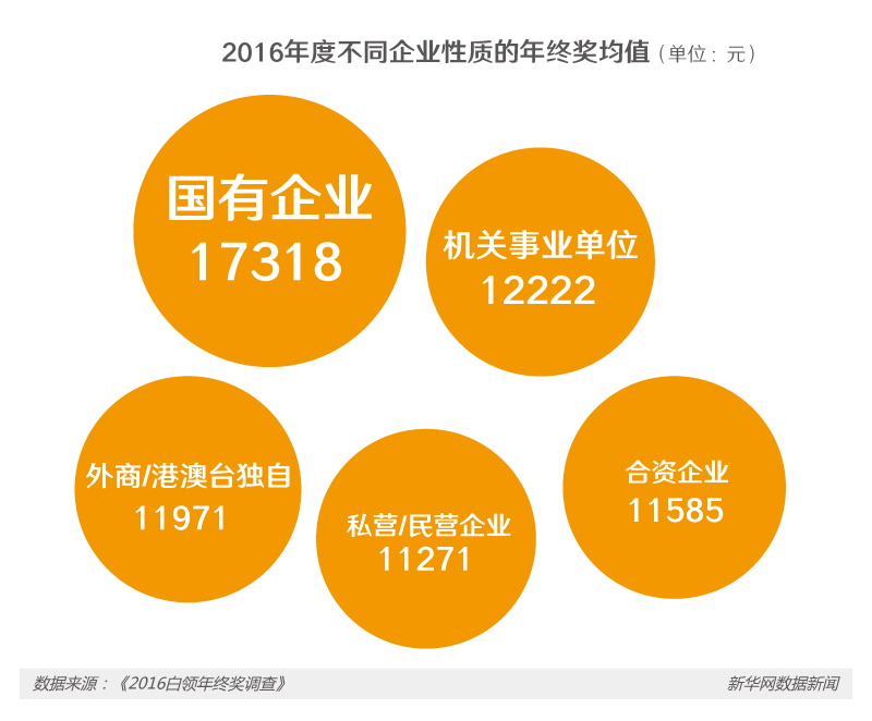 数据显示,2016年年终奖的总体平均值为12821元,整体水平较前一年略有上升。从不同行业来看, 金融行业白领的年终奖平均值最高,达1.7万元;从不同企业性质来看,国有企业年终奖平均值较高;私营/民营企业年终奖平均值最低,但与前一年相比也有了明显的提升。