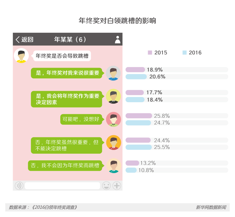 值得关注的是,目前白领对于年终奖的满意度仍然较低,大部分仍未达到心理预期。而与此同时,年终奖对白领下一年度的职业变动仍有一定影响:当被问及是否会因为年终奖发放情况而选择跳槽时,39%的白领明确表示会作为重要的参考因素,且与2015年相比,年终奖对白领跳槽的影响程度处于上升状态。