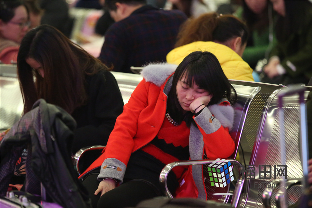 一位旅客睡着了,也许她辛苦了一年,想到马上可以回家,睡得很放心