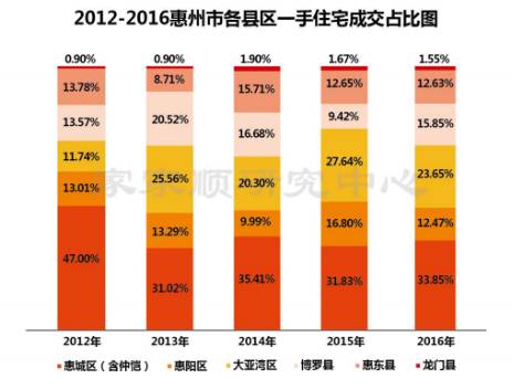 过去5年,惠城一手住宅成交面积一直处于领先地位。2016年惠阳、大亚湾等临深区域成交面积总占比有所下降。