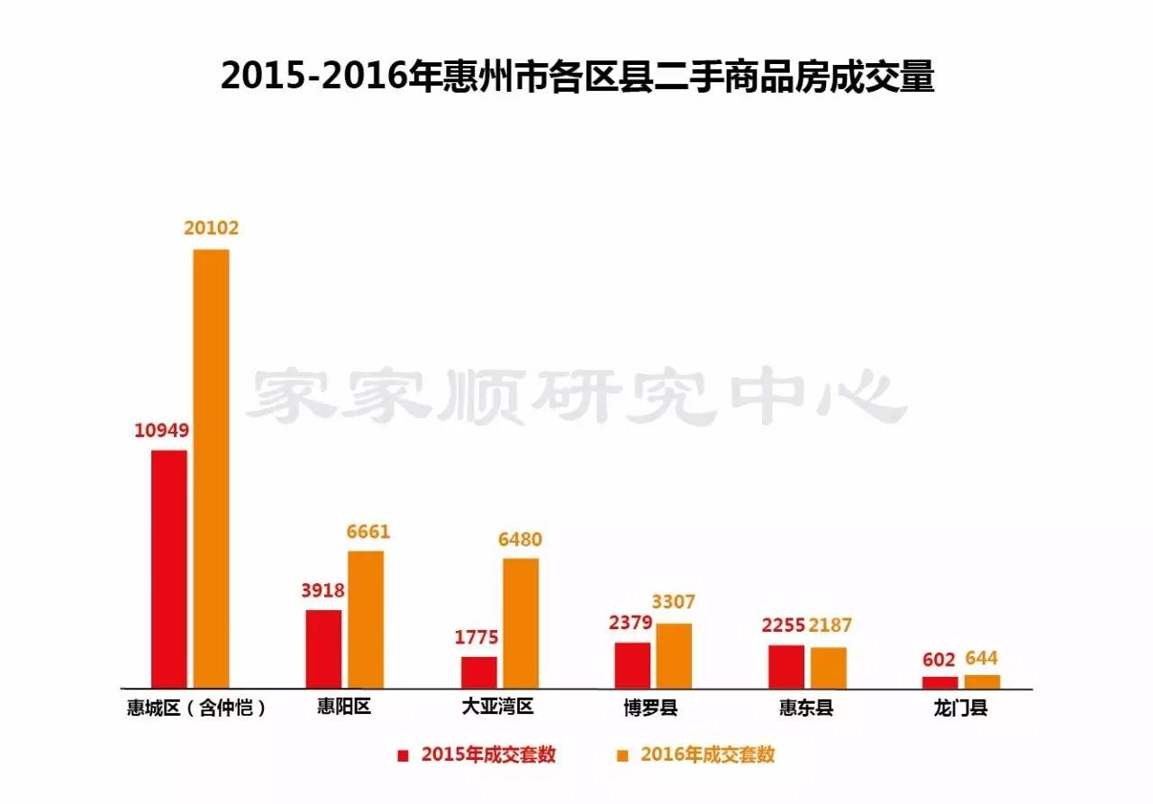 2016年惠州全市二手房商品房成交39381套,环比上涨80%,其中惠城(含仲恺)、惠阳、大亚湾三区表现活跃,环比涨幅较大。