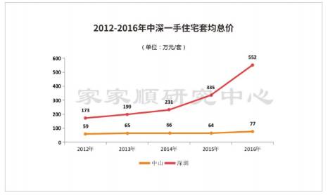 以中山每年一手住宅成交金额与套数计算,得出了 2016 年中山套均总价为 77 万元/套,虽然对比前些年有一定程度的上涨,但对比近五年深圳套均,中山一手住宅的价格竞争力还是非常明显的。