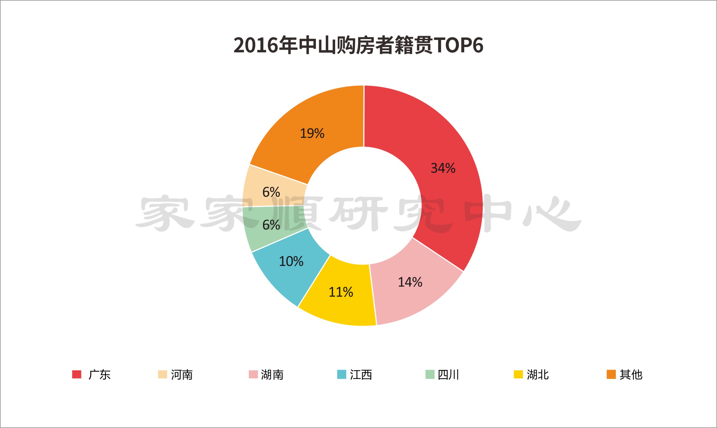 数据显示,中山购房者约 34% 为广东籍客户,其次为湖南和湖北,分别占比 14% 和 11%,排名前六名的省份占比达 81%。