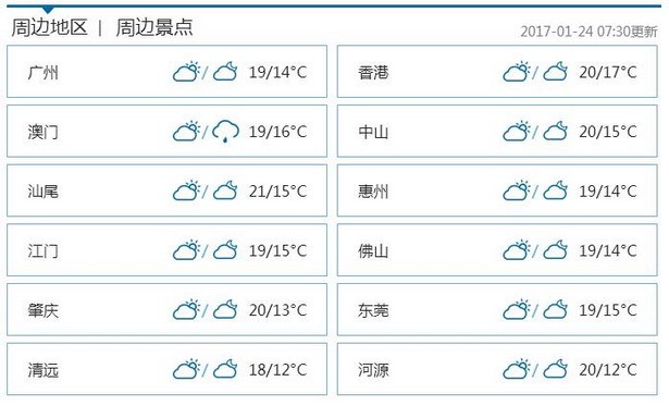 近两日来深圳天气舒适,1月23日深圳白天最高气温21~22℃。预计1月24~25日云量增多,其中1月24日夜间到1月25日上午有零星小雨和轻雾,能见度较差,正值春运客流高峰期,提醒市民注意交通安全。