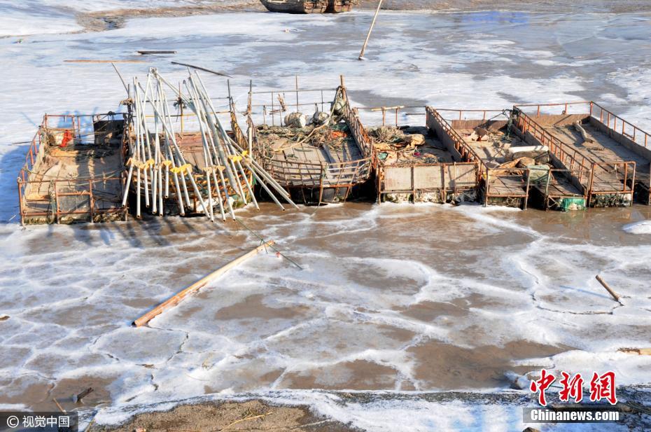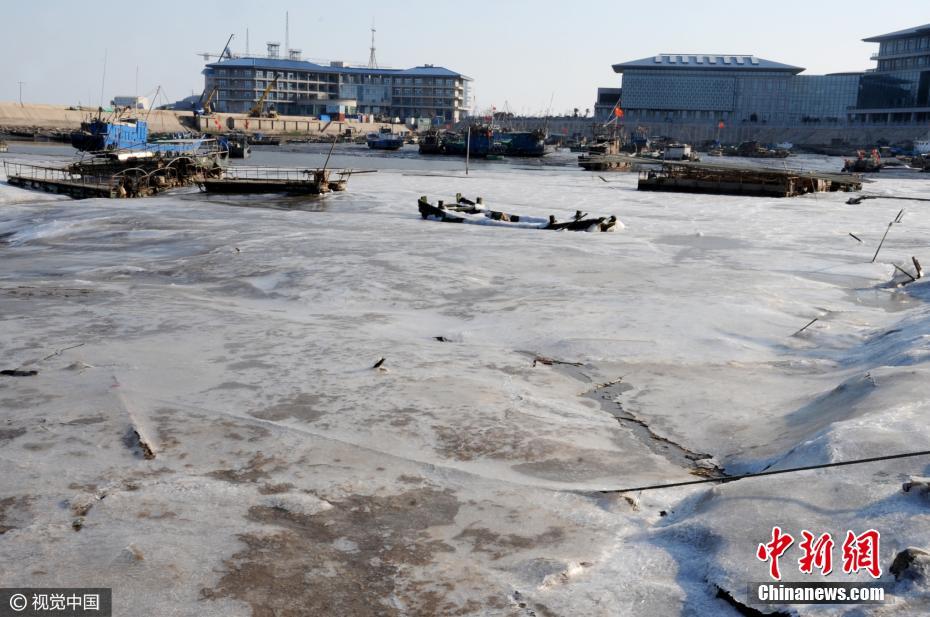 江苏连云港西墅渔村海边的渔船被大面积的冰凌围封。连日来,江苏连云港沿海受持续低温影响,气温创新低,最低温度-7℃,海滨出现大面积凌絮景观。