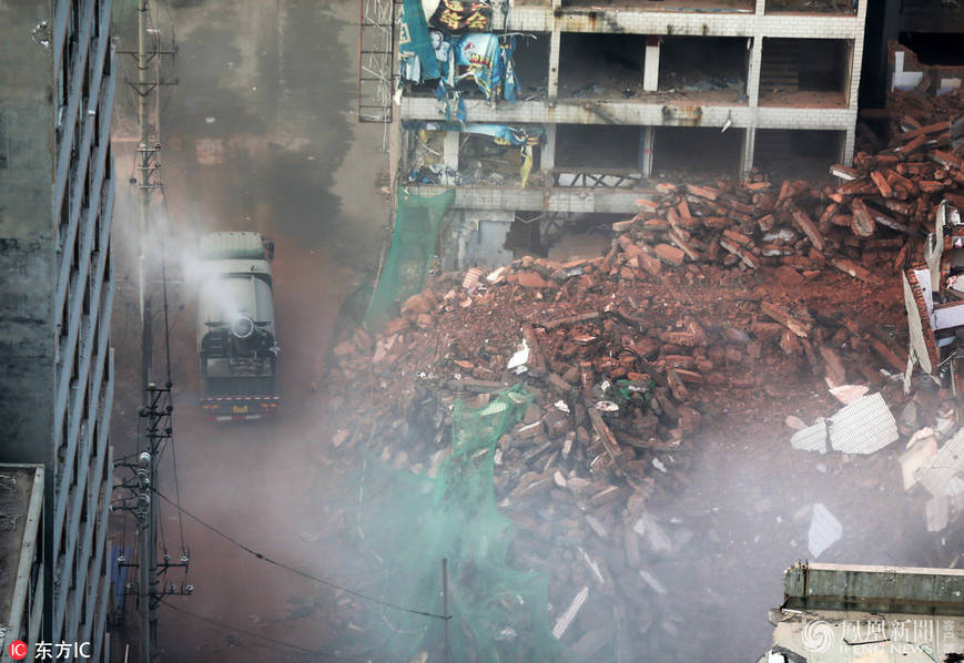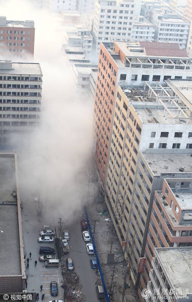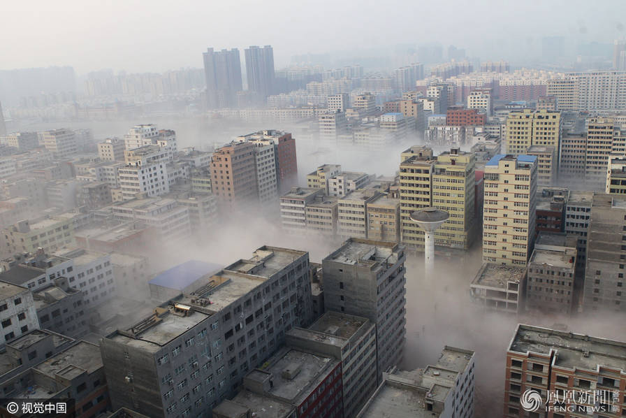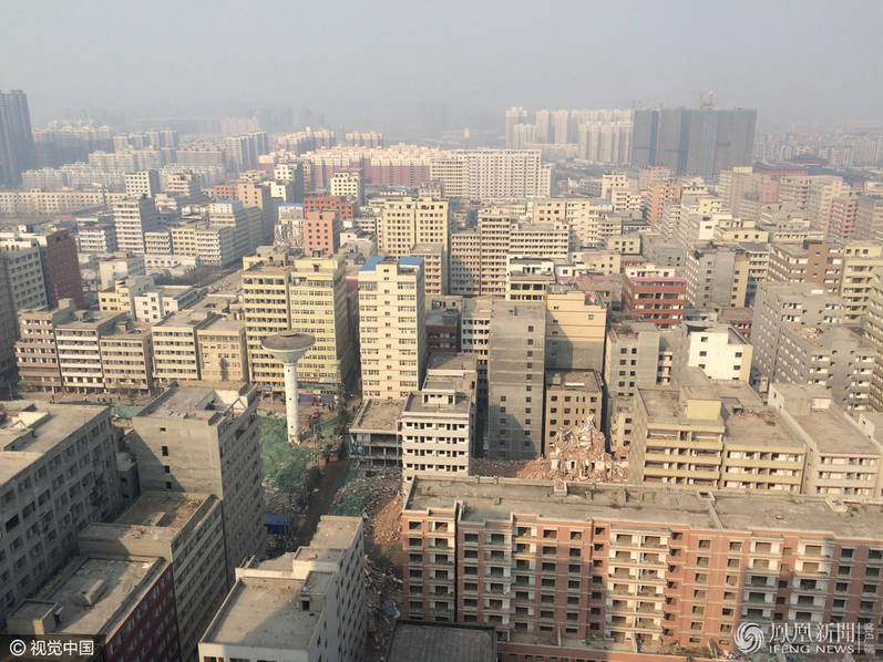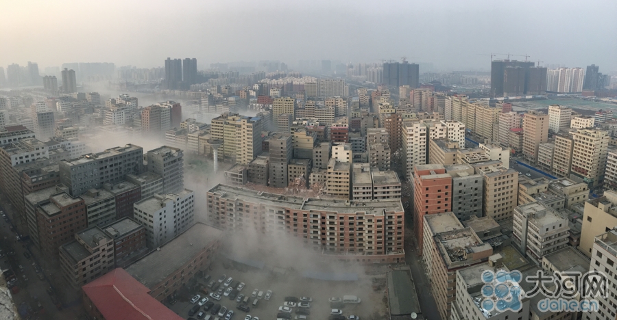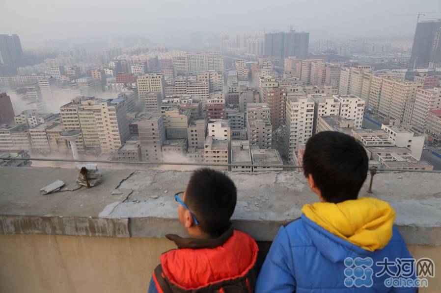 2017年1月23日,河南省郑州市,金水区陈砦村于15时启动爆破拆除工作,其中9栋楼在经过一系列准备后,实施了爆破拆除。陈寨是郑州最大的城中村,被郑州市民称为“小香港”,是很多人初来郑州的第一站。爆破负责人称,陈寨村村民房屋爆破量约135万平方米,此次爆破是百万平方米民房爆破拆除的全国首例。CFP/大河网/东方IC