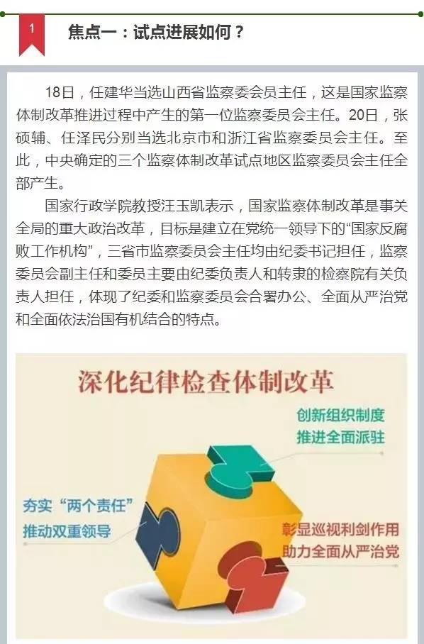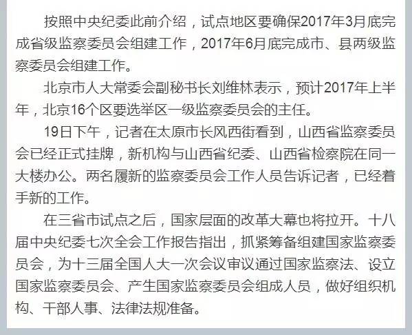 随着北京、山西、浙江人代会闭幕,三个监察体制改革试点地区首任监察委员会主任均已陆续选出,备受关注的监察体制改革进入实质性阶段。