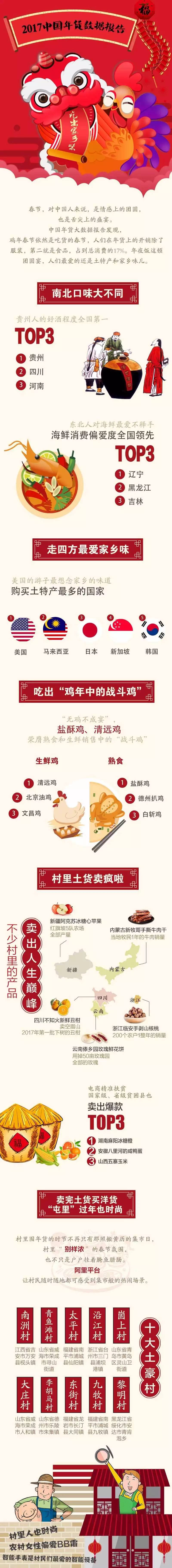 中国年货大数据报告首先盘点了“鸡年的战斗鸡”。正所谓“无鸡不成宴”,在鸡年春节,什么样的鸡更受吃货们欢迎?数据显示,年货节期间,与鸡相关的熟食销售中,酥脆香嫩的盐酥鸡的销量遥遥领先,击败德州扒鸡、白斩鸡、辣子鸡和叫化鸡,登上鸡类熟食的冠军宝座。