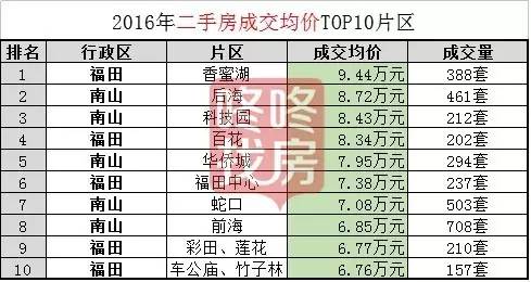 根据我们统计数据,二手房成交均价排名全市的片区,全部集中在福田和南山,各占半壁江山。其中,福田的香蜜湖片区以9.44万/㎡的成交均价,排名榜首。第二的是南山的后海片区。