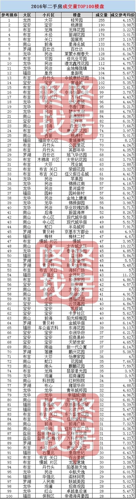 布吉大芬片区的桂芳园以255套的成交(龙岗布吉成交最多),排名第一;第二名成交量的楼盘是宝安西乡的桃源居,190套(宝安成交最多);
