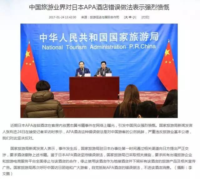 1月24日,国家旅游局新闻发言人张利忠针对日本APA连锁酒店在客房内放置右翼书籍事件表示:APA酒店这种错误做法是对中国游客的公然挑衅,严重违反旅游业基本公德,对此坚决反对。