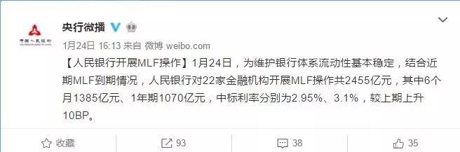 24日下午,央行通过官方微博公布,当日对22家金融机构开展MLF操作共2455亿元,包含六个月和一年期,且其中标利率分别较上期上调10BP至2.95%和3.1%。